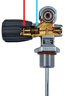 紅色箭頭標示的是閥桿密封圈。過去當閥門全開且過度鎖緊時,這個密封圈很容易損壞。損壞後,閥門在關閉時會發生漏氣。這會讓使用者在關閉時更加用力鎖緊。進而導致閥座(藍色箭頭)受損。話說回來,現在的新設計已經排除了這種損壞的可能性。